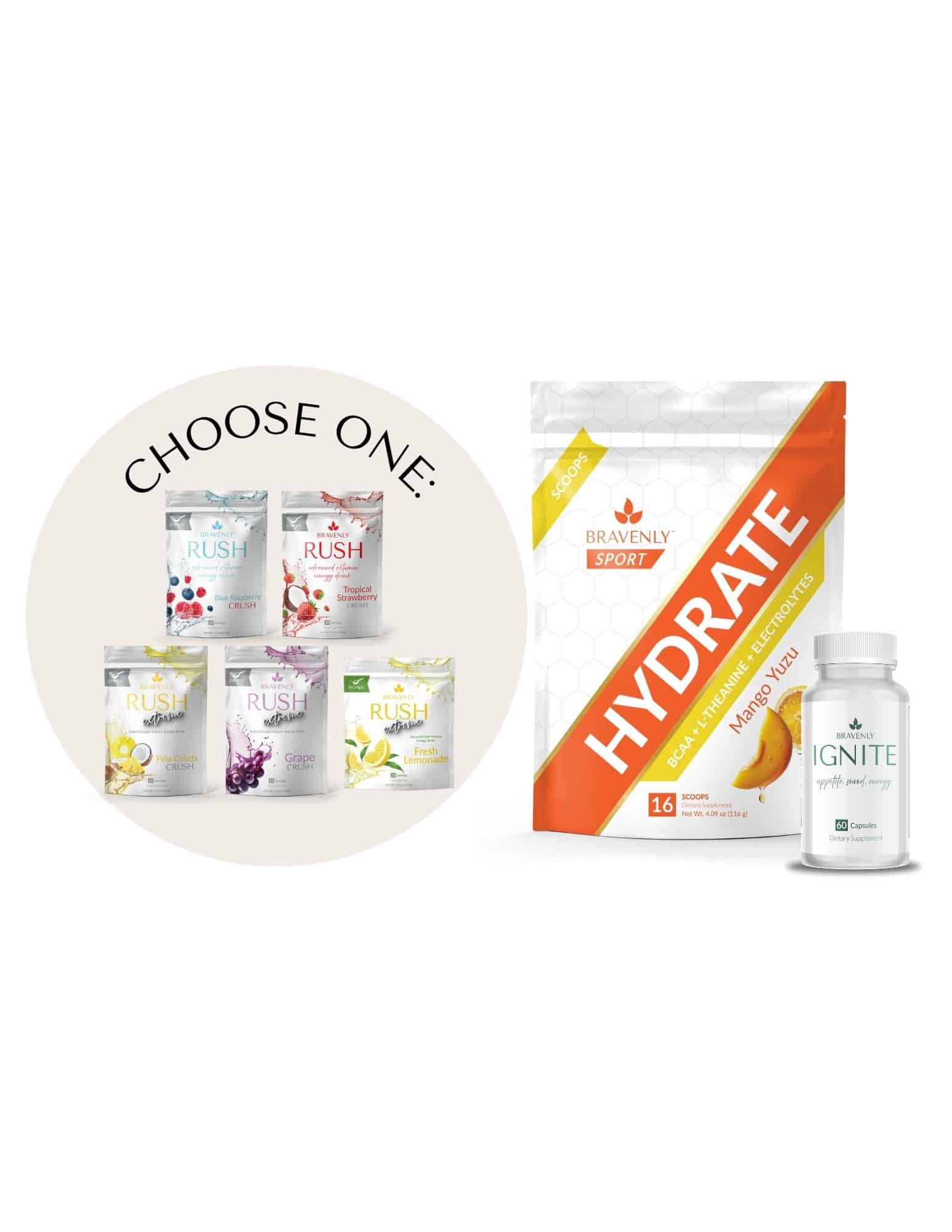 Included: HYDRATE – Mango Yuzu, IGNITE, and your choice of RUSH or RUSH EXTREME